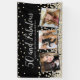 Elegant custom birthday banner design featuring gold and silver confetti over a black background, modern script typography with the words "50 and Fabulous" (in silver), "Happy Birthday" with your custom name (in silver), and three of your favourite photos framed in metallic silver foil squares.