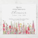 Perfect table decor for an August birthday party. Pink gladiolus is the birth flower for that month. It forms a pretty watercolor bottom border on this floral personalised napkin. The birthday guest of honour's name, age and birthdate are placed above it using elegant calligraphy and typography. All text is editable.