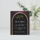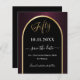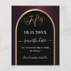 A Save the Date card for a 50th birthday party. A black and burgundy background, decorated with a faux gold arch. Personalise and add a date and your name. The text: Fifty and Save the Date is written with a large trendy hand lettered style script.