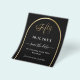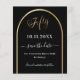 A Save the Date for a 50th birthday party. A black background, decorated with a faux gold arch. Personalise and add a date and your name. The text: Fifty and Save the Date is written with a large trendy hand lettered style script.