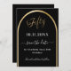 A Save the Date card for a 50th birthday party. A black background, decorated with a faux gold arch. Personalise and add a date and your name. The text: Fifty and Save the Date is written with a large trendy hand lettered style script.