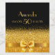 Elegant, classic, glamourous and feminine for a 50th birthday. A gold coloured ribbon and bow with golden glitter and sparkle, a bit of bling and luxury. Black background. Templates for a name, date of birth and date of anniversary and age number. Golden letters.