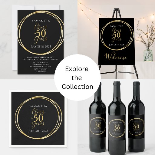 This is a chic and elegant 50th birthday party invitation. This stylish design is in classic black and gold. It has the message, "Samantha", "Cheers to 50 years" and the celebration date on the front and back. This modern, typography motif is framed by an elegant gold foil effect circle. on the front it also has space for you to add your party and RSVP details. This stylish design is perfect for a chic and unforgettable 50th birthday party or celebration. To personalise, simply add your name, date, party venue and RSVP information in the personalise this text box. To change the colour or font, check out the design editing tool. If you need help with personalisation, or for a custom design contact me via zazzle char or email: ursuladawnmoon@gmail.com