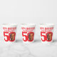 Personalise these bright red and white 50th birthday party paper cups with your own birthday name and two photograph in the 0 of 50. Fun text and personalised photo design. Ideal for using at a fiftieth birthday party to show a photo of your birthday boy or girl now and one from their past. Other matching items are available. © Original graphic art and design by www.mylittleeden.com