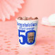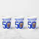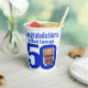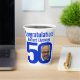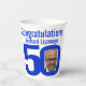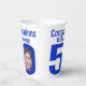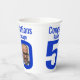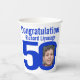 Personalise these bright blue text on white 50th birthday party paper cups with your own birthday name and two photograph in the 0 of 50. Fun text and personalised photo design. Ideal for using at a fiftieth birthday party to show a photo of your birthday boy or girl photos one now and one from their past. Other matching items are available. © Original graphic art and design by www.mylittleeden.com