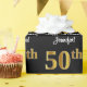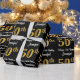This luxurious, elegant, and sophisticated birthday-themed wrapping paper design features a large ordinal number “50th” having an imitation/faux gold-inspired appearance, along with the birthday greeting message “Happy 50th Birthday,” and an editable recipient name in a script-style font. It also has a black-coloured background. Birthday themed wrapping paper like this might be a fun way to wrap a gift or present being given to somebody who is celebrating their fiftieth birthday. [~Z0000515]