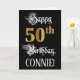 The front of this fancy and formal birthday themed greeting card design features the message “Happy 50th Birthday,”, plus a customisable recipient name. Some of the message is in an elegant script-style text, the large number “50th” features a faux/imitation gold-inspired look pattern, and the background is coloured black. The inside has a customised birthday greeting message, or could perhaps be cleared and left blank if a message is to be written by hand instead. A luxurious, personalised birthday greeting card like this might be used to acknowledge somebody’s fiftieth birthday. [~Z0000559]