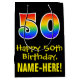 This fun, exciting, and colourful birthday gift bag design features a large number "50" with a rainbow spectrum gradient inspired pattern, along with the message "Happy 50th Birthday,", and an editable recipient name. It also has a black-coloured background. A birthday themed gift bag like this might be used when giving a gift or present in celebration of somebody’s 50th birthday. [~Z0000512]