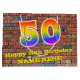 This colourful and vibrant birthday-themed gift bag design, inspired by urban art, features a large number "50" having a rainbow spectrum gradient inspired pattern. It also features the message "Happy 50th Birthday,", and an editable name. It also has a brick wall style pattern background. A birthday themed giftbag like this might be a fun way to wrap a gift or present being given to celebrate somebody’s fiftieth birthday. [~Z0000522]