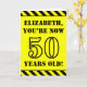 The front of this fun and attention-grabbing birthday themed greeting card design features an editable name and the message "YOU’RE NOW 50 YEARS OLD!" in black stencil style text on a yellow colored background. There is also an eye-catching yellow and black stripes pattern at the top and bottom edges of the front. The inside features a personalized birthday greeting message, or could perhaps be cleared and left blank if a message is to be written by hand instead. A customizable birthday card like this might be a fun way to send a message in celebration of somebody’s fiftieth birthday. [~Z0000413]