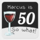 50th Birthday Funny Inspirational Red Wine Man Square Sticker. Modern red wine sticker for a man celebrating the fiftieth birthday - red wine in glass and black background. Personalizable it with the name, you can also change the age number. It comes with a funny and inspirational quote 50 so what and is perfect for a man with a sense of humour.