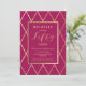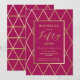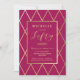 This elegant and trendy 50th birthday celebration invitation can be customised for your special occasion. It features a gold frame and gold background geometric lines. The word "Fifty" is in a stylish script font. The background colour and text can be changed to your liking. A perfect invite for an adult's milestone birthday.