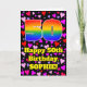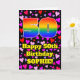 The front of this joyful and cheerful birthday greeting card design features a large number “50” having a rainbow spectrum gradient inspired pattern. It also features the message “Happy 50th Birthday,”, and a custom name. The background of the front features a pattern of heart shapes with colours like red, pink, and purple. The inside has a custom birthday greeting message, or could perhaps be cleared and left blank if a message is to be written by hand instead. A fun, editable birthday greeting card like this might be used to acknowledge somebody’s fiftieth birthday. [~Z0000551]