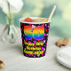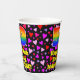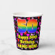 This fun and colourful birthday themed paper cup design features a large number “50” with a rainbow spectrum gradient inspired pattern, along with the message “Happy 50th Birthday,”, and a custom name. The background features a pattern of heart shapes with colours like pink, purple, and red. Cheerful, joyful paper cups like this might be fun to use at a birthday celebration/party being held in celebration of somebody’s fiftieth birthday. [~Z0000548]