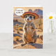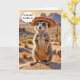 A meerkat stands upright wearing a colourful sombrero in a desert landscape with cacti and mountains in the background for a 50th Birthday.