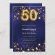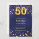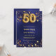 A modern, stylish invitation for a 50th birthday. A navy blue background, decorated with golden stars. The blue colour is uneven. Personalise and add your name and party details.
