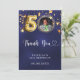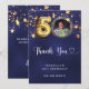 A thank you card for a 50th birthday. A navy blue background colour. The blue colour is uneven. With faux gold stars. Add your photo. On front: number 50 written with a balloon style font. Thank You, your text, title and a date.
