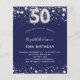 A modern, stylish and glamourous invitation for a 50th birthday party. A navy blue background, decorated with faux silver stars. Personalise and add your name and party details. Number 50 is written with a balloon style font.
