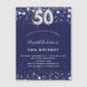 A modern, stylish and glamourous invitation for a 50th birthday party. A navy blue background, decorated with faux silver stars. Personalise and add your name and party details. Number 50 is written with a balloon style font.
