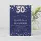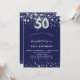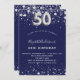 A modern, stylish and glamourous invitation for a 50th birthday party. A navy blue background, decorated with faux silver stars. Personalise and add your name and party details. Number 50 is written with a balloon style font.