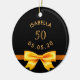Elegant, classic, glamourous and feminine. A faux gold coloured bow and a ribbon, a bit of bling and luxury for a 50th birthday party decor, favour, keepsake or as a gift. Black background. Template for a name, age 50 and a date. Date of birth or date of the party. Golden letters and curved text.
