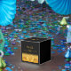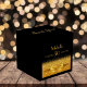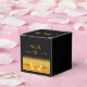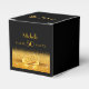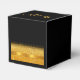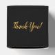 Elegant, classic, glamourous and feminine style favour box. A gold coloured ribbon and bow with golden glitter and sparkle, a bit of bling and luxury for a 50th birthday party. Black background. With the text: Thank You! on top.
