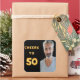 A trendy 50th birthday party sticker. With the text: Cheers to 50 on front written with faux gold balloon letters. Black background. Template for your photo.