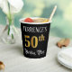 This luxurious and opulent birthday paper cup design features a customisable name and the message “50th Birthday Party”. The large number “50th” has a faux/imitation gold-inspired colouring pattern, the words “Birthday Party” are in elegant script-style text, and the background is coloured black by default (although it can be customised). Fancy, ornate paper cups like this might be used at a birthday party/celebration being held in celebration of somebody’s fiftieth birthday. [~Z0000567]