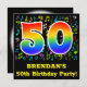 The front of this fun, colourful, and exciting birthday party invitation design features a large number "50" with a rainbow spectrum gradient inspired pattern, along with a customisable name and the message "50th Birthday Party!". Part of the background features a fun pattern of various music notes and symbols having a variety of colours and sizes. The back features personalised details/information pertaining to the event that the potential guests are being invited to. Joyful, customisable birthday celebration invitation cards like this might be used when inviting guests to attend a gathering being held to celebrate a song composer’s, a musician’s, a singer’s, or somebody else’s fiftieth birthday. [~Z0000427]