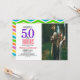 Modern, 50th birthday photo invitation you can personalise and send out for your fiftieth birthday party celebration. The words "50 and Fabulous" are set using popular typography. Replace the sample photo with your own. The red and black text colours can be changed using the edit menu. A multicolor chevron pattern adorns the back of the card. Other colours and patterns are available.