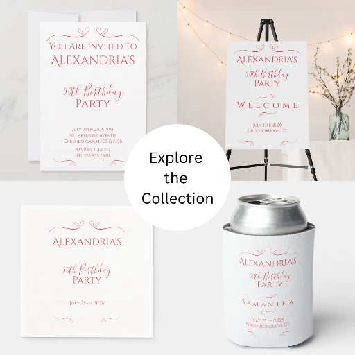 This is a modern, minimal, 50th Birthday party invitation. It has trending typography in red/ pink with a white background. On the front it says, "You Are Invited To Alexandria's 50th Birthday Party", with information about the date, venue and RSVP details underneath. The text is framed by stylish swirl hearts. This elegant and modern design is perfect for your 50th birthday party or celebration. Simply type your details, name, age, date, venue and RSVP information, into the personalise this text box. Here you can also change the rest of the text if you want to. To change the colour or font, check out the design editing tool. If you need help with personalisation, or for a custom design contact me via zazzle chat or email: ursuladawnmoon@gmail.com