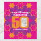 Bright pink and yellow 50th birthday add your own photo wine labels. Add your own fiftieths birthday photo to the 0 of 50 and customise with the birthday message / name of your choice. Currently reads Happy Birthday Katherine 50 a classic vintage. A great way to customise your alcoholic birthday gifts. Unique design by Sarah Trett. www.sarahtrett.com