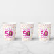 Bright colourful confetti random dots birthday 50th two photos now and then paper party cups. Bright deep pink, coral, hot pink, red, yellow and golden yellow. Add your own birthday girl's photo in the centre of the 0 in 50 on both sides, ideal for a past and present photo opportunity and customise with your own name and party congratulations words. Currently reads Happy Birthday Michelle 50 and Fabulous! Other matching items and milestone birthday years available. Original design by www.mylittleeden.com on zazzle.