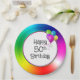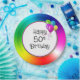 Bold neon abstract rainbow design with party ballons for a 50th birthday party.