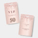 A modern, stylish and glamourous badge for a 50th birthday party. A faux rose gold metallic looking background with an elegant faux rose gold glitter drip, paint drip look. The name is written with a modern dark rose gold coloured hand lettered style script. With the text: VIP Number 50 is written with a balloon style font, script.