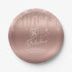Elegant and chic personalised 50th birthday party paper plates. "50 & Fabulous" is written in stylish white script against a rose gold background, with rose gold faux glitter dripping from the top. You can personalise with her name and date of the party.