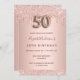 A modern, stylish and glamorous invitation for a 50th birthday party. A rose gold background with drips, paint drip look. The name is written with a modern dark rose gold colored hand lettered style script. Personalize and add your party details. Number 50 is written with a balloon style font, script.