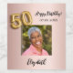 A rose gold, blush pink background decorated. Personalise and add a date, name and a photo. Age number written with a balloon style font.