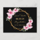 On front: Trendy tropical style. With a faux gold geometric frame decorated with pink hibiscus, flowers tropical florals with some greenery. A chic black background. Templates for a name and date. Golden letters. The name and the text: Save the Date are written with a modern hand lettered style script.