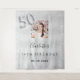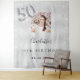 A welcome tapestry for a glamourous 50th birthday party. A faux silver metallic looking background decorated with faux glitter dust. Personalise and add a high quality photo, name and date. Number 50 is written with a balloon style font.