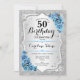 50th Birthday Invitation. Elegant floral design in silver and icy blue. Features faux glitter silver stripes, turquoise roses stylish script font and confetti. Perfect for a glam birthday party.