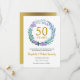 This Save the Date Announcement Card for the 50th wedding anniversary features a delicate floral greenery wreath made of bluebells, plants, and lilac flowers. It can be easily personalized with your special golden vow renewal information. Back of the invitation features your anniversary dates in elegant white text on the golden background.