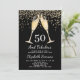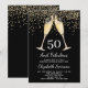 A modern surprise 50th birthday party invitation featuring a champagne glasses toast and confetti. Gold on black.