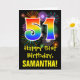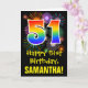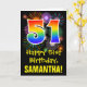 The front of this exciting, colourful, and fun birthday greeting card design features a large number "51" with a rainbow spectrum gradient inspired pattern, along with the message "Happy 51st Birthday,", and a custom recipient name. The front additionally has a colourful background pattern inspired by bursting celebratory fireworks. The inside features a personalised birthday greeting message, or could perhaps be cleared and left blank if a message is to be written by hand instead. A personalised birthday card like this might be a fun way to celebrate somebody’s fifty first birthday. [~Z0000442]