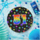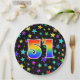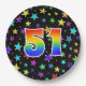 This colourful, cheerful, and fun paper plate design features a large number "51" having a rainbow spectrum gradient inspired pattern colouring. The background features a pattern of colourful star shapes. Fun paper plates like this might be used at somebody’s fifty first birthday party, or a couple’s 51st anniversary celebration, or some other 51st event. [~Z0000493]