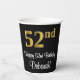 This stylish, sophisticated, and luxurious birthday-themed paper cup design features a large ordinal number “52nd” having an imitation/faux gold-inspired appearance, along with the birthday greeting message “Happy 52nd Birthday,” and a customisable name in a script-style font. The background is coloured black. Sophisticated paper cups like this might be fun to use at a birthday party in honour of somebody’s 52nd birthday. [~Z0000538]