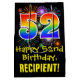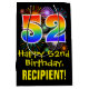 This exciting, colourful, and fun birthday themed gift bag design features a large number "52" with a rainbow spectrum gradient inspired pattern, along with the message "Happy 52nd Birthday,", and a personalised recipient name. It also features a colourful background pattern inspired by the look of bursting celebratory fireworks. A fun gift bag like this might be used when wrapping presents being given to somebody in celebration of their fifty second birthday. [~Z0000509]