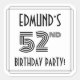 This elegant fifty-second birthday party/celebration square sticker design features an editable name, an intricate art deco style inspired number “52nd”, the message “BIRTHDAY PARTY!”, and a multi-line border. Stickers like these might be used when celebrating somebody’s fifty second birthday. [~Z0000618]