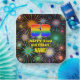 This eye-catching and joyful birthday themed paper plate design features a large number “53” having a colourful rainbow spectrum inspired gradient pattern. It also features the message “HAPPY 53rd BIRTHDAY,”, and an editable name. The background of the front features a vibrant, colourful, bursting celebratory fireworks-inspired pattern. Paper plates like this might be used when celebrating somebody’s 53rd birthday. [~Z0000604]