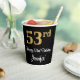 This elegant, luxurious, and stylish birthday paper cup design features a large ordinal number “53rd” having an imitation/faux gold-like gradient pattern, along with the birthday greeting message “Happy 53rd Birthday,” and a personalised name in a script-style font. It also has a black-coloured background. Luxurious birthday themed paper cups like this might be used at a birthday party in celebration of somebody’s fifty third birthday. [~Z0000538]